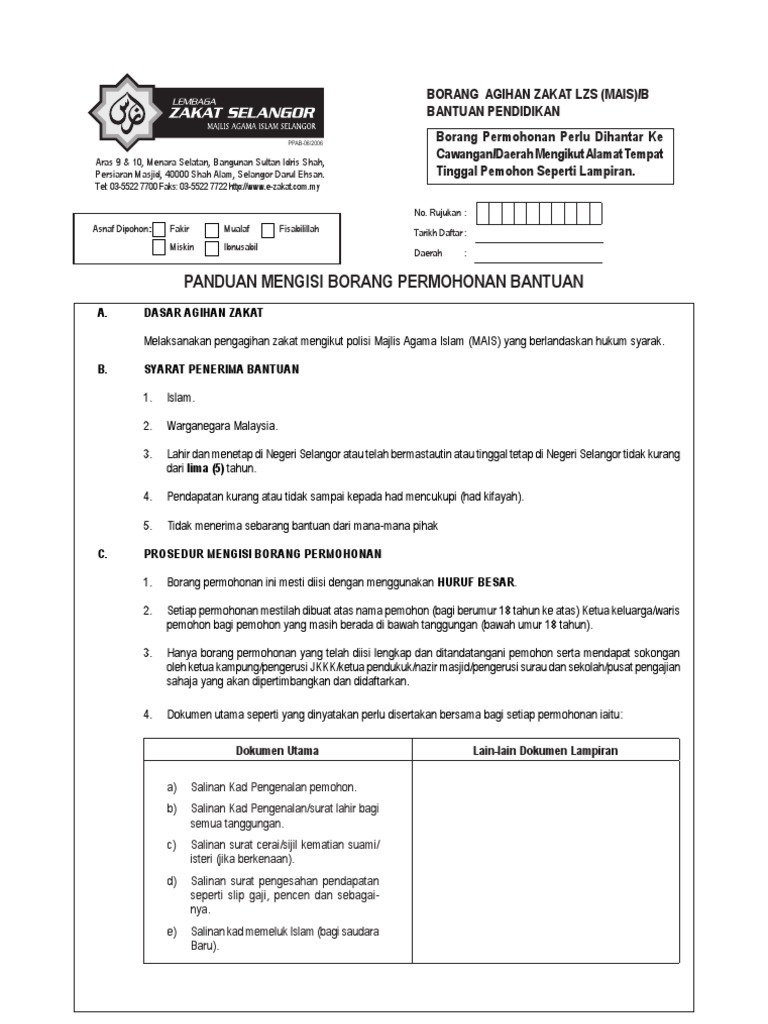 . Senarai Borang Lembaga Zakat Selangor 2022. Cara Bayar syarat kelayakan mohon. Tiap-tiap Pemohon mestilah mengisi borang permohonan bantuan yang boleh.